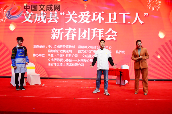 文成新聞網(wǎng)訊(記者 潘聰聰)為進一步提升市容環(huán)衛(wèi)管理水平,提高環(huán)衛(wèi)工人的政治、社會地位,增強環(huán)衛(wèi)工人的光榮感、使命感和責任感,營造尊重環(huán)衛(wèi)工人、支持環(huán)衛(wèi)工作、熱愛環(huán)衛(wèi)事業(yè)、提高環(huán)衛(wèi)意識的社會氛圍,1月25日晚,由縣委宣傳部、縣精神文明建設(shè)指導中心、縣綜合行政執(zhí)法局、縣文化和廣電旅游體育局、縣僑聯(lián)聯(lián)合主辦的2019年度“關(guān)愛環(huán)衛(wèi)工人”新春團拜會在我縣舉辦,300余名一線環(huán)衛(wèi)工人歡聚一堂,共慶新春佳節(jié)。副縣長毛偉新出席本次活動并致辭,為環(huán)衛(wèi)工人們送上新春祝福。