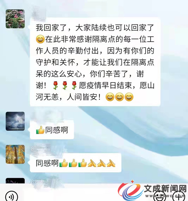 “我回家了,大家陸續也可以回家了,在此非常感謝隔離點的每一位工作人員的辛勤付出,因為有你們的守護和關懷,才能讓我們在隔離點呆得這么安心,你們辛苦了,謝謝!愿疫情早日結束,愿山河無恙,人間皆安!”一名解除隔離后的入住人員在微信群里發來一段這樣的話,不僅是對國際隔離觀察點每個人的激勵和工作人員的肯定,也表達了所有人戰勝疫情的決心。戰“疫”一線,一個也不能少,在國際隔離觀察點,工作人員用真心、耐心、細心為所有入住人員提供了安心“避風港”。