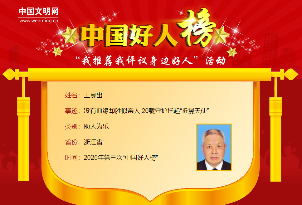 來自文成縣雙桂鄉的王良出獲評助人為樂類“中國好人”。這位76歲的老黨員,用二十載光陰守護一名非親非故的智力殘疾兒童,以超越血緣的親情,在浙南山區譜寫了一曲“大愛無疆”的動人贊歌。(王良出的事跡詳見報道:不是親爺爺,卻給了最親的愛!——七旬老人王良出20年守護“折翼天使”)