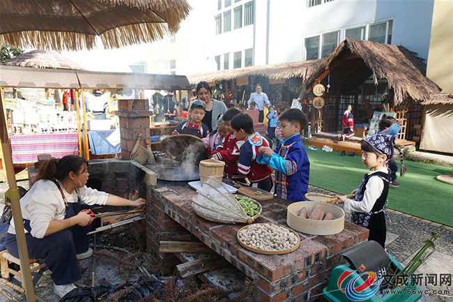活動現場,孩子們身著畬族服飾分成多組,直奔自己感興趣的區域,倒糍粑、烏米飯制作、腌鴨蛋、曬秋,制作畬族風情的飾品、刺繡以及稻草編制等等。各種各樣的畬族民俗體驗,讓整個活動現場熱鬧非常。每個體驗區塊前,只見孩子們在手藝人的帶領下,一點點跟著做,認真的學習也是將事情做得有模有樣,成功親手制作出了烏米飯、糍粑等,在養殖區和音樂區等區塊,孩子們也是樂在其中。
